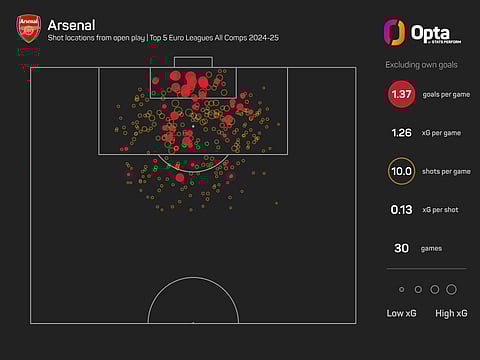 Across all competitions, Arsenal have averaged 1.37 goals from open play per 90 minutes this season, from an average of 1.26 xG per game. Both of those figures are down on 2023-24, when the Gunners scored 1.46 goals per game from open play, averaging 1.32 xG.