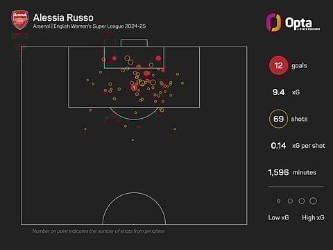 She is tied for top scorer in the WSL with Khadija Shaw on 12 goals, though she has recorded a higher expected goals tally than the Man City striker (9.4 xG to Shaw's 8.3). In fact, Russo's xG is the highest in the league.