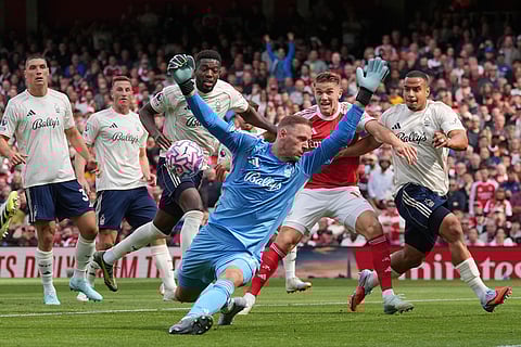 Nottingham Forest's goalkeeper Matz Sels saves during the Premier League soccer match between Arsenal and Nottingham Forest in London.