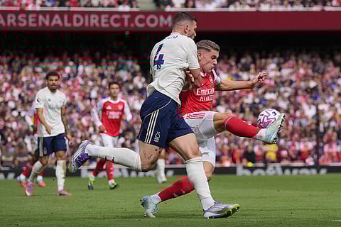 Arsenal's Viktor Gyokeres receives the ball in front of Nottingham Forest's Morato during the Premier League soccer match between Arsenal and Nottingham Forest in London.