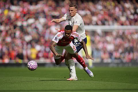 Arsenal's Jorginho escapes a tackle by Nottingham Forest's Murillo during the Premier League soccer match between Arsenal and Nottingham Forest in London.