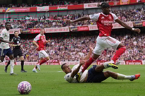 Arsenal's Eberechi Eze, front, and Nottingham Forest's Nikola Milenkovic fight for the ball during the Premier League soccer match between Arsenal and Nottingham Forest in London.