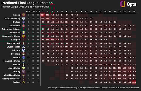 According to the supercomputer's 2025-26 season predictions, Arsenal's hopes of clinching the title dropped to 64.2% following their draw with Sunderland, but they are still significantly higher than those of second-placed Manchester City, at 22.4%.