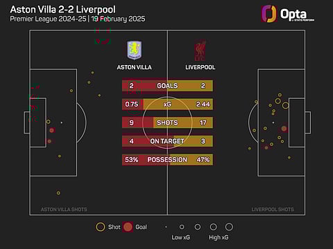The Reds ended the contest with an expected goals (xG) total of 2.44 from their 17 shots to Villa's 0.73 from the nine efforts they attempted during the contest.