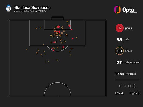 In Serie A, Scamacca scored 11 times from chances worth just 6.54 expected goals (xG), with only Lautaro Martinez (+6.36) and Teun Koopmeiners (+5.47) overperforming their underlying figures by a greater margin than him (+5.46).