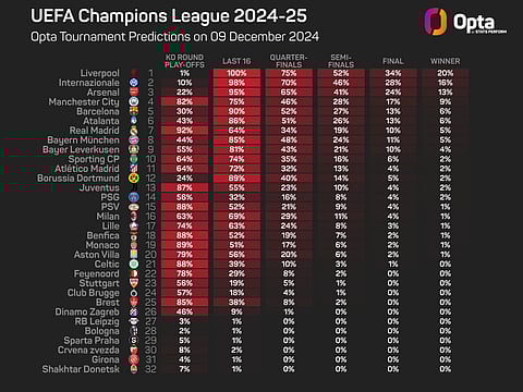The Opta supercomputer currently gives Madrid a 5% chance of retaining their Champions League crown, and they only reach the last 16 in 64% of tournament simulations. They are given a 92% chance of featuring in the knockout-phase play-offs.