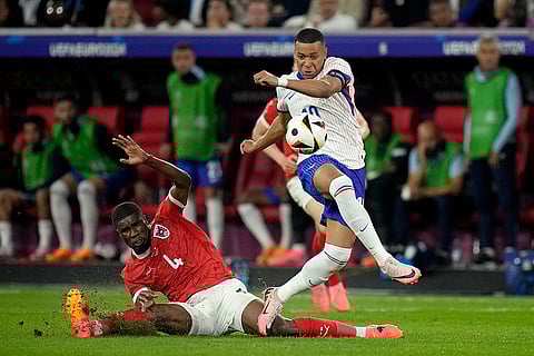Austria's Kevin Danso, left, challenges Kylian Mbappe of France during a Group D match between Austria and France at the Euro 2024 soccer tournament in Duesseldorf, Germany.