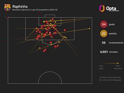 He also equalled Cristiano Ronaldo's 2013-14 Champions League record of 21 goal contributions in a single season in the competition, while only eight-time Ballon d'Or winner Lionel Messi (14 in 2011-12) has scored more goals for Barcelona in a single campaign than Raphinha's 13.