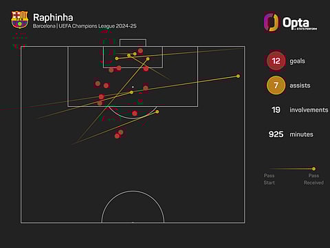 With a goal and two assists here, Raphinha became the first player in Champions League history to record more than 10 goals and more than five assists in a single campaign (12 goals, seven assists).