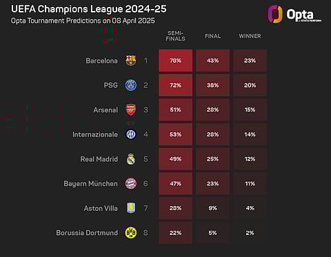 They are also considered the Opta supercomputer's favourites to win the Champions League with a 23.1% chance, while they are given 78.2% chance of eliminating Dortmund ahead of Wednesday's first leg at home.