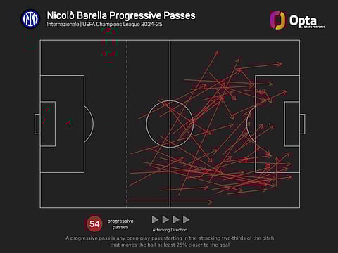 But Inter are not all about defensive fortitude, with Nicolo Barella capable of springing devastating counter-attacks from midfield. He has averaged 7.1 progressive passes per 90 minutes in the Champions League this season, the most of any player to play at least 500 minutes in the competition.