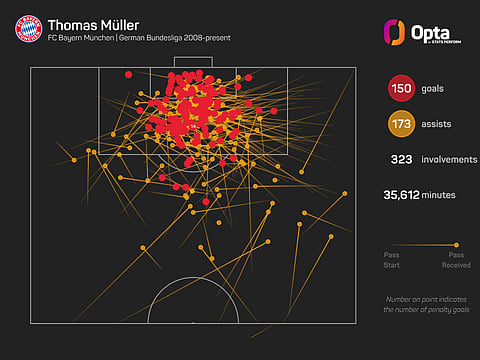 Since Muller made his Bundesliga debut in August 2008, he has 323 goals and assists combined.
