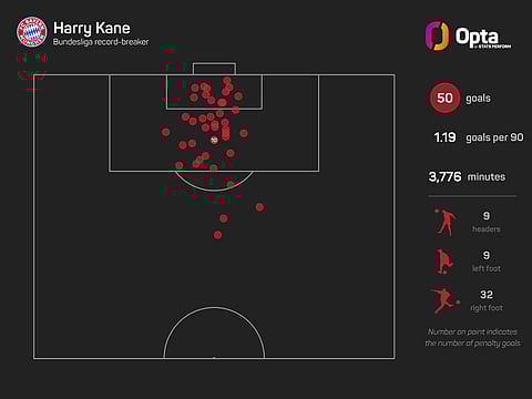 Ten of Kane's 50 Bundesliga goals have come from penalties, while 32 of them have been with his right foot, nine with his left and nine with his head.