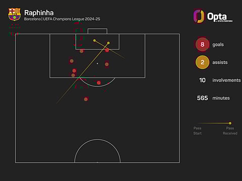 That is Barcelona's latest winning goal on record in the competition (since 2003-04), while his 10 goal involvements (eight goals, two assists) are the most of any player in the Champions League this season.