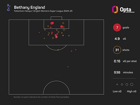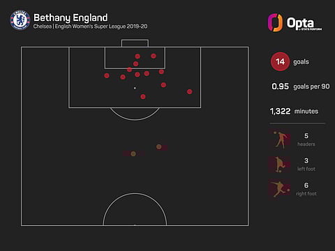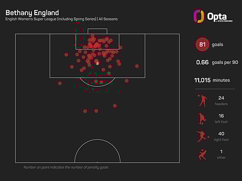 England is a complete forward with all types of goals. She has netted seven times from outside the box in her WSL career, while she has scored with her weaker foot 16 times, and 40 from her right.