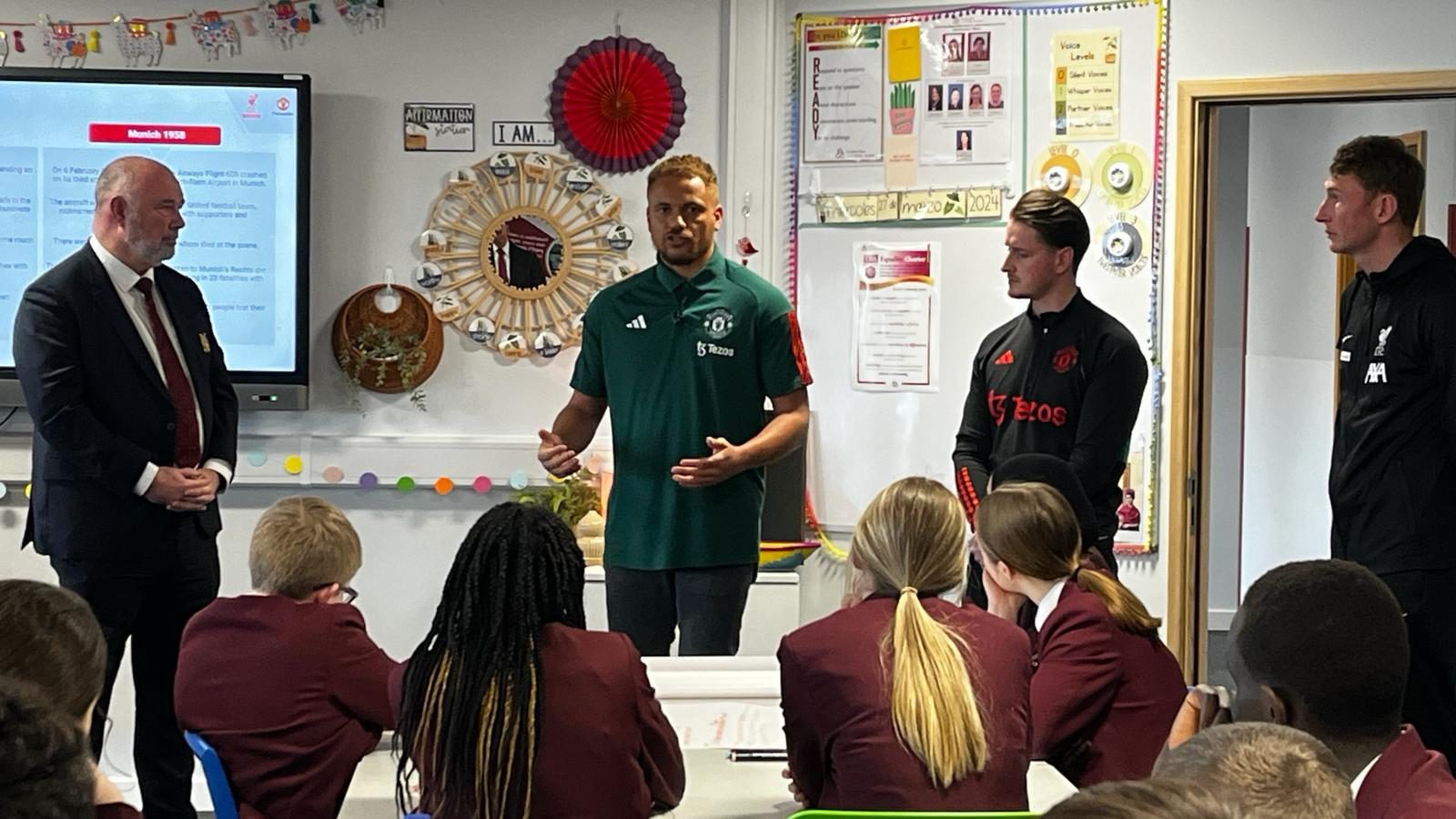 Former Liverpool captain Phil Thompson and ex-United defender Wes Brown were both involved as a session for schoolchildren from both Manchester and Liverpool was held at the Lord Derby Academy in Huyton, Merseyside, on Wednesday.