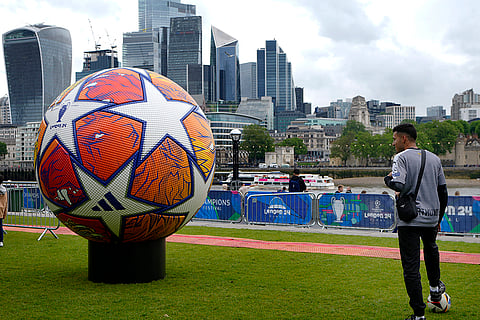 A football fan looks towards a giant Champions League football at the Champions Festival in Potters Fields Park near Tower Bridge in London.