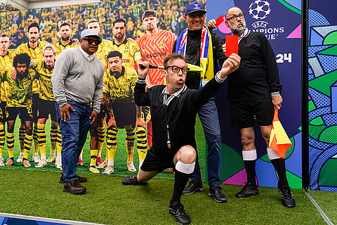 A fan dressed up as a referee shows a red card as he poses with fans at a fan zone in Trafalgar Square, in London ahead of tomorrow's UEFA Champions League final at Wembley stadium between Borussia Dortmund and Real Madrid.