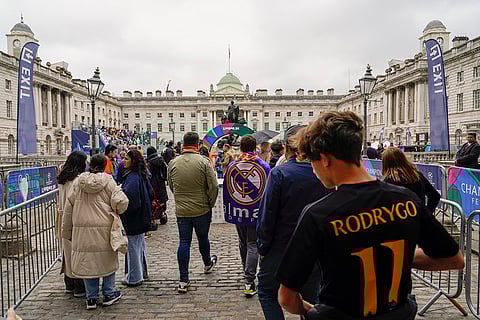 Fans wearing Real Madrid jerseys enter a fan zone at the Somerset House, in London ahead of tomorrow's UEFA Champions League final at Wembley stadium between Borussia Dortmund and Real Madrid.