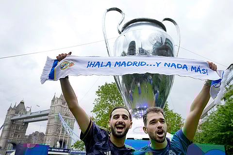 Football fans pose by a giant replica of the Champions League Trophy at the Champions Festival in Potters Fields Park near Tower Bridge in London.