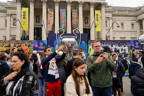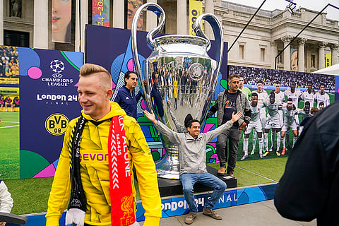 Fans pose for photographs next to a giant copy of the trophy in a fan zone in Trafalgar Square, in London ahead of tomorrow's UEFA Champions League final at Wembley stadium between Borussia Dortmund and Real Madrid.