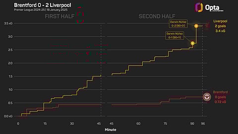 The Reds pushed for a winner throughout, having 37 attempts and accumulating 3.4 expected goals (xG). Overall, they had eight shots on target, scoring with the final two.