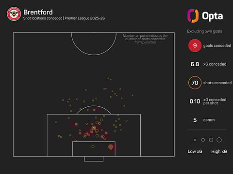 Brentford have conceded 10 goals in their five Premier League games this season, their most at this stage of a league season since 2003-04 in the third tier (also 10).