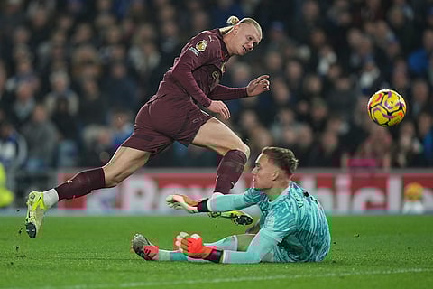 Manchester City's Erling Haaland scores during the English Premier League soccer match between Brighton and Manchester City at Falmer Stadium in Brighton, England.