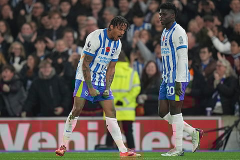 Brighton's Joao Pedro, left, celebrates after scoring during the English Premier League soccer match between Brighton and Manchester City at Falmer Stadium in Brighton, England.