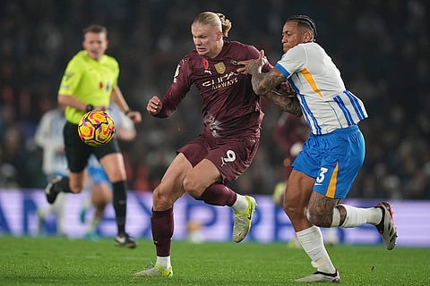 Manchester City's Erling Haaland, left, and Brighton's Igor Julio fight for the ball during the English Premier League soccer match between Brighton and Manchester City at Falmer Stadium in Brighton, England.