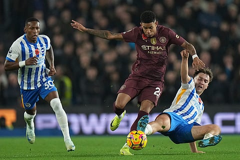 Brighton's Adam Webster tackles Manchester City's Savinho during the English Premier League soccer match between Brighton and Manchester City at Falmer Stadium in Brighton, England.