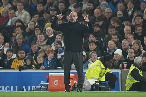 Manchester City's head coach Pep Guardiola watches the end of the English Premier League soccer match between Brighton and Manchester City at Falmer Stadium in Brighton, England.