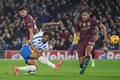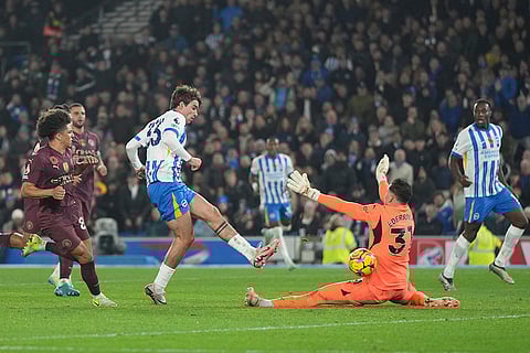Brighton's Matt O'Riley scores during the English Premier League soccer match between Brighton and Manchester City at Falmer Stadium in Brighton, England.