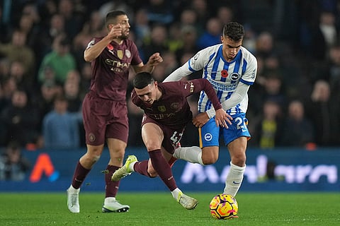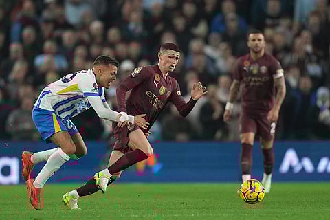 Brighton's Yasin Ayari fouls Manchester City's Phil Foden during the English Premier League soccer match between Brighton and Manchester City at Falmer Stadium in Brighton, England.