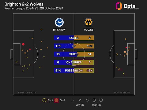Rayan Ait-Nouri halved Wolves' deficit in the 88th minute, then Brighton missed a glorious four-on-one chance at one end and conceded a stoppage-time equaliser seconds later, Matheus Cunha powering home to double Wolves' points tally for the campaign.
