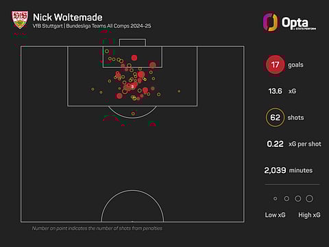 He netted 12 goals in the Bundesliga from 10.4 expected goals (xG), an overperformance of 1.6. The striker also had the best shot conversion rate (24.5%) of any Stuttgart player to score more than once.