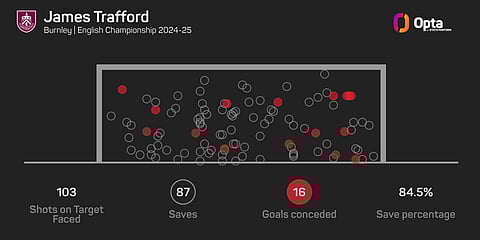According to Opta's expected goals on target (xGoT) model, only Stoke's Viktor Johansson (15.8) prevented more goals than Trafford (12.5) among Championship goalkeepers in 2024-25, with the Clarets goalkeeper registering a save percentage of 84.5%.