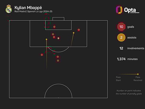 The Frenchman has now been involved in 49 goals in 2024 as a player for Paris Saint-Germain (23 goals, eight assists) and Madrid (14 goals, four assists) in all competitions, with only Harry Kane (50) involved in more.