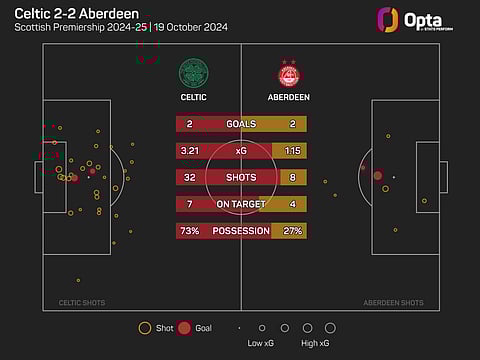 Celtic fired off 32 shots to Aberdeen's eight throughout the course of the game, racking up 3.21 expected goals (xG) to the visitors' 1.15.