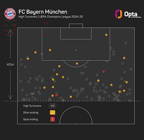 Key to success in this match could well be if Bayern get their press right. They have forced the most high turnovers (120) of any team during the league phase of this season’s Champions League, while they turned 21 of those into shots (joint-most).