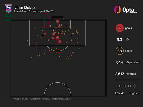 Ten of Delap's Premier League strikes for Ipswich were non-penalty goals, with no other player netting more than four for the Tractor Boys. His 12 goals came from 9.3 expected goals (xG), giving him an overperformance of 2.7 xG.
