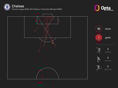 Chelsea dominated the first half, entering the break with an expected goals (xG) total of 0.49 from their five shots, while also restricting Everton to just one effort at Robert Sanchez's goal.