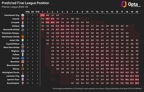 It will come as a surprise to nobody to learn City are overwhelming favourites to defend their title in 2024-25, the Opta supercomputer giving them an 83% chance of topping the pile.