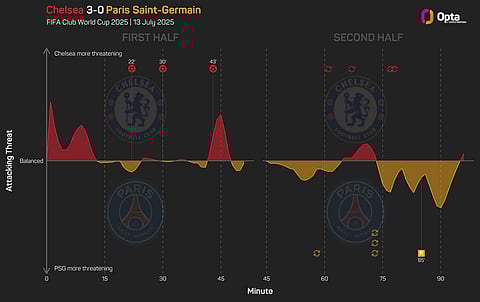Chelsea dominated the first half, scoring with all three of their shots on target, while limiting PSG to just two attempts.