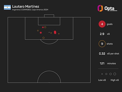 Martinez is also the Argentina player with the most shots (nine). In fact, since his debut in the Copa America in 2019, Martinez is the tournament's top scorer with nine goals (two in 2019, three in 2021, four in 2024), four more than Messi and Luis Diaz (five each).