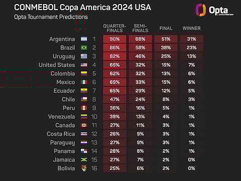 As mentioned, Argentina are the clear favourites, with Opta's model handing them a 31 per cent chance of winning their 16th Copa crown.