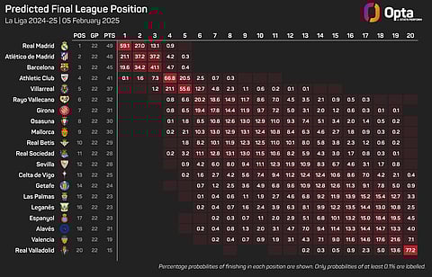They are considered more likely to be crowned champions than Barcelona (19.6%), with neighbours Madrid (59.1%) their foremost competitors.