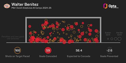 Benitez kept nine clean sheets in the top flight, conceding 39 goals and averaging a save percentage of 61.39%, slightly lower than Henderson (66.67%) in the Premier League.
