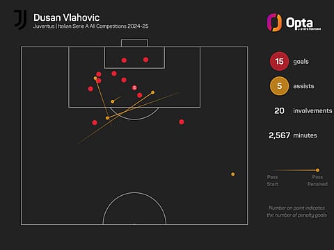 Vlahovic also led the way for shots (111) among his team-mates, while only Kenan Yildiz (six) bettered his tally of five assists.