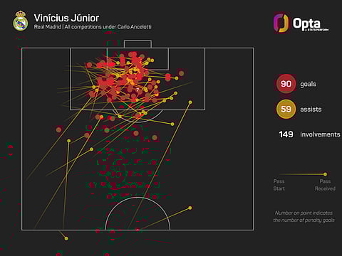 Vinicius scored 90 goals and provided 59 assists in 198 appearances under Ancelotti in all competitions, averaging 0.75 goal involvements per game while playing for the Italian.